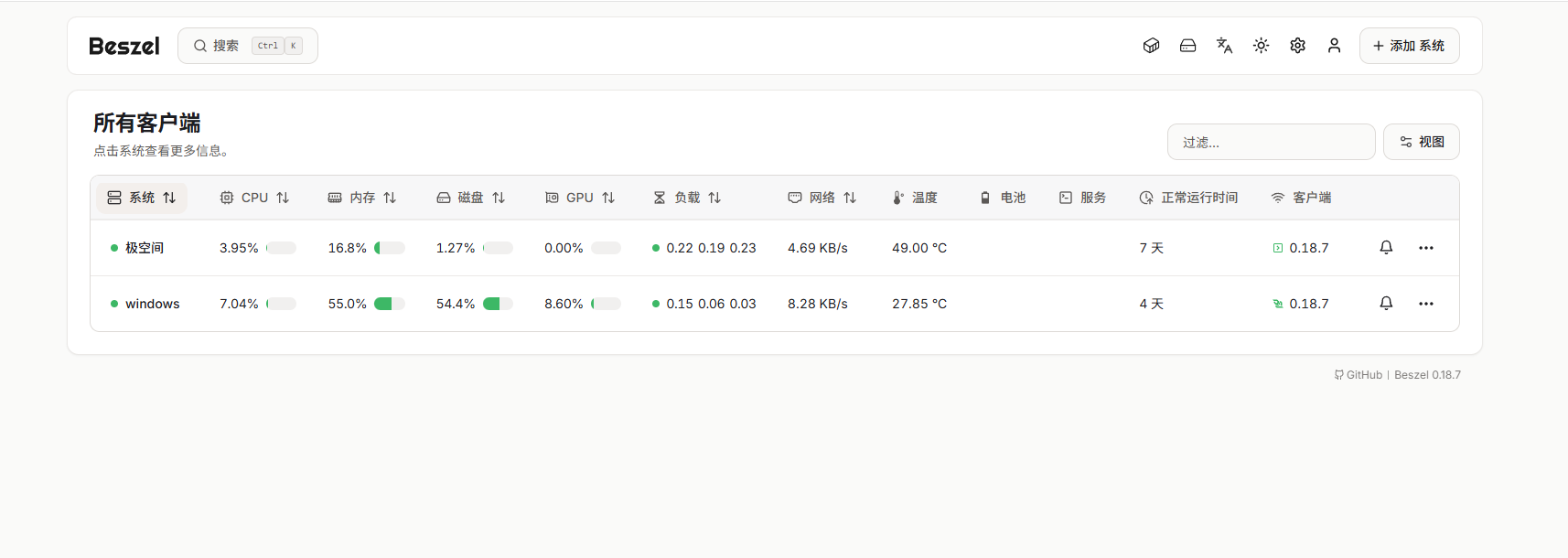 Beszel正是这样一款专注于简洁与效率的轻量级多服务器监控解决方案。它以极简的设计哲学为核心,无需繁杂配置,即可快速实现对CPU、内存、磁盘、网络等关键指标的集中可视化监控。无论是管理几台VPS的独立开发者,还是希望快速搭建临时监控环境的DevOps工程师,Beszel都能提供“开箱即用”的流畅体验。