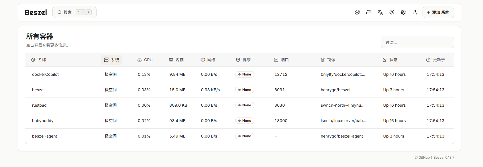 - 镜像地址:henrygd/beszel(可在Docker Hub搜索验证)