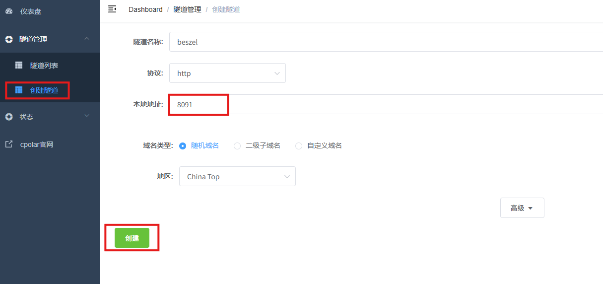 - 隧道名称:可自定义,本例使用了:beszel,注意不要与已有的隧道名称重复
