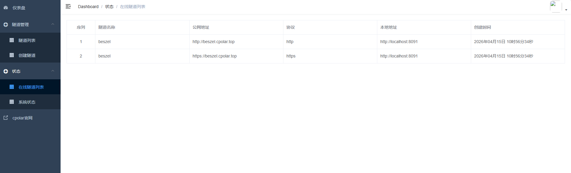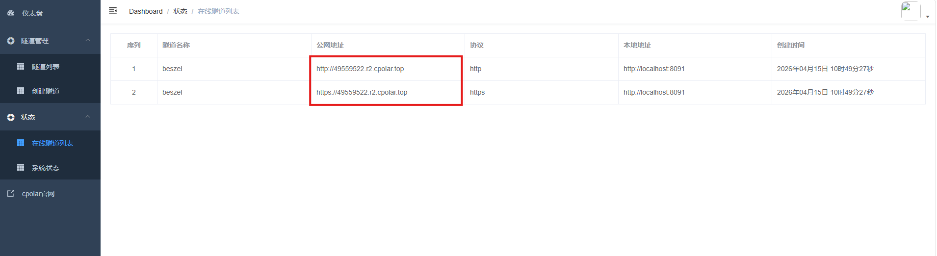 更新完成后,打开在线隧道列表,此时可以看到随机的公网地址已经发生变化,地址名称也变成了保留和固定的二级子域名名称。