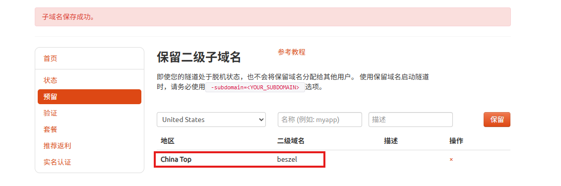 - Sub Domain:填写保留成功的二级子域名