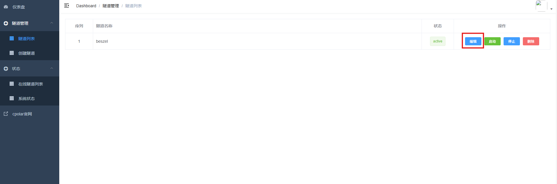 登录cpolar web UI管理界面,点击左侧仪表盘的隧道管理——隧道列表,找到所要配置的隧道,点击右侧的编辑。
