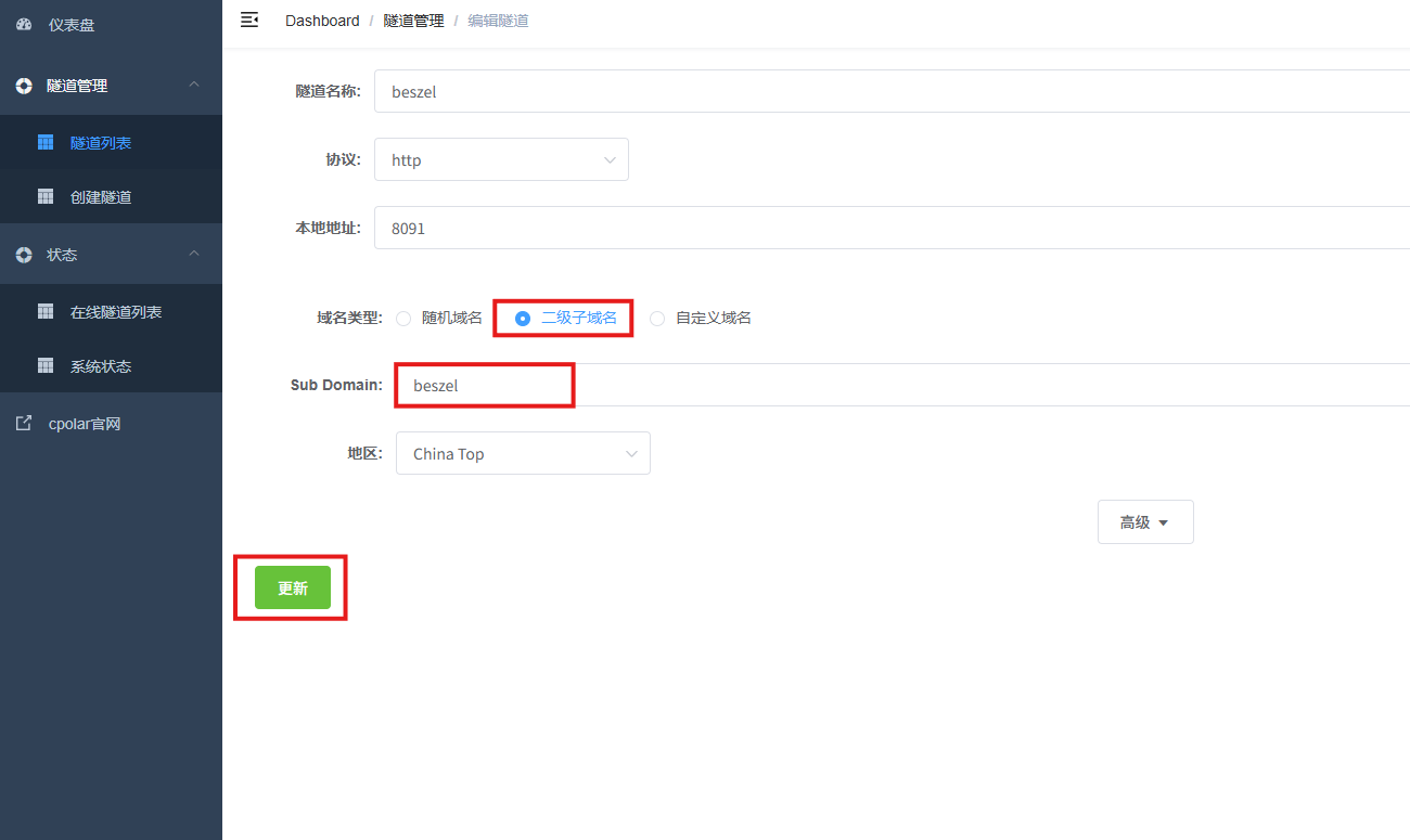 修改隧道信息,将保留成功的二级子域名配置到隧道中