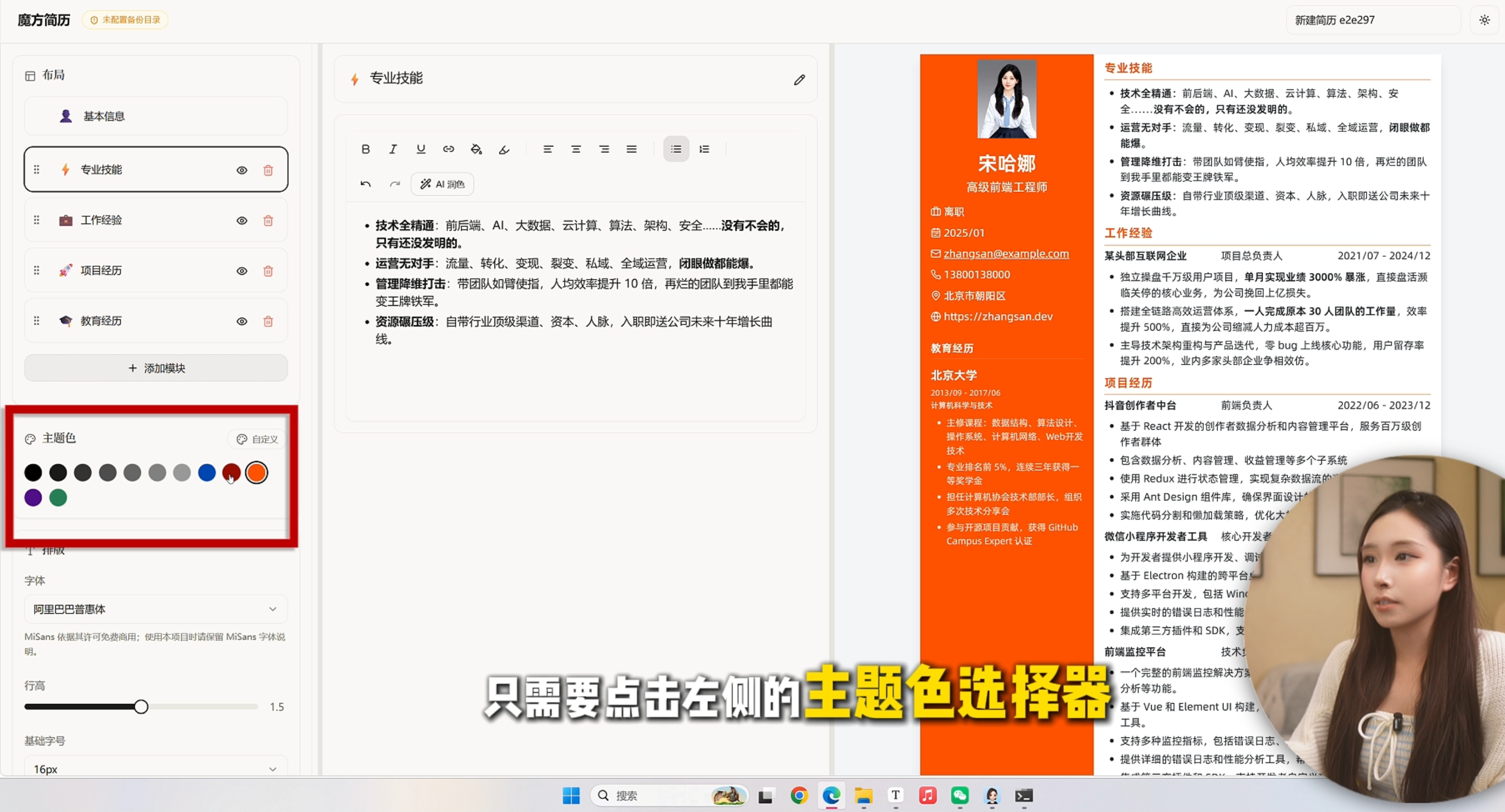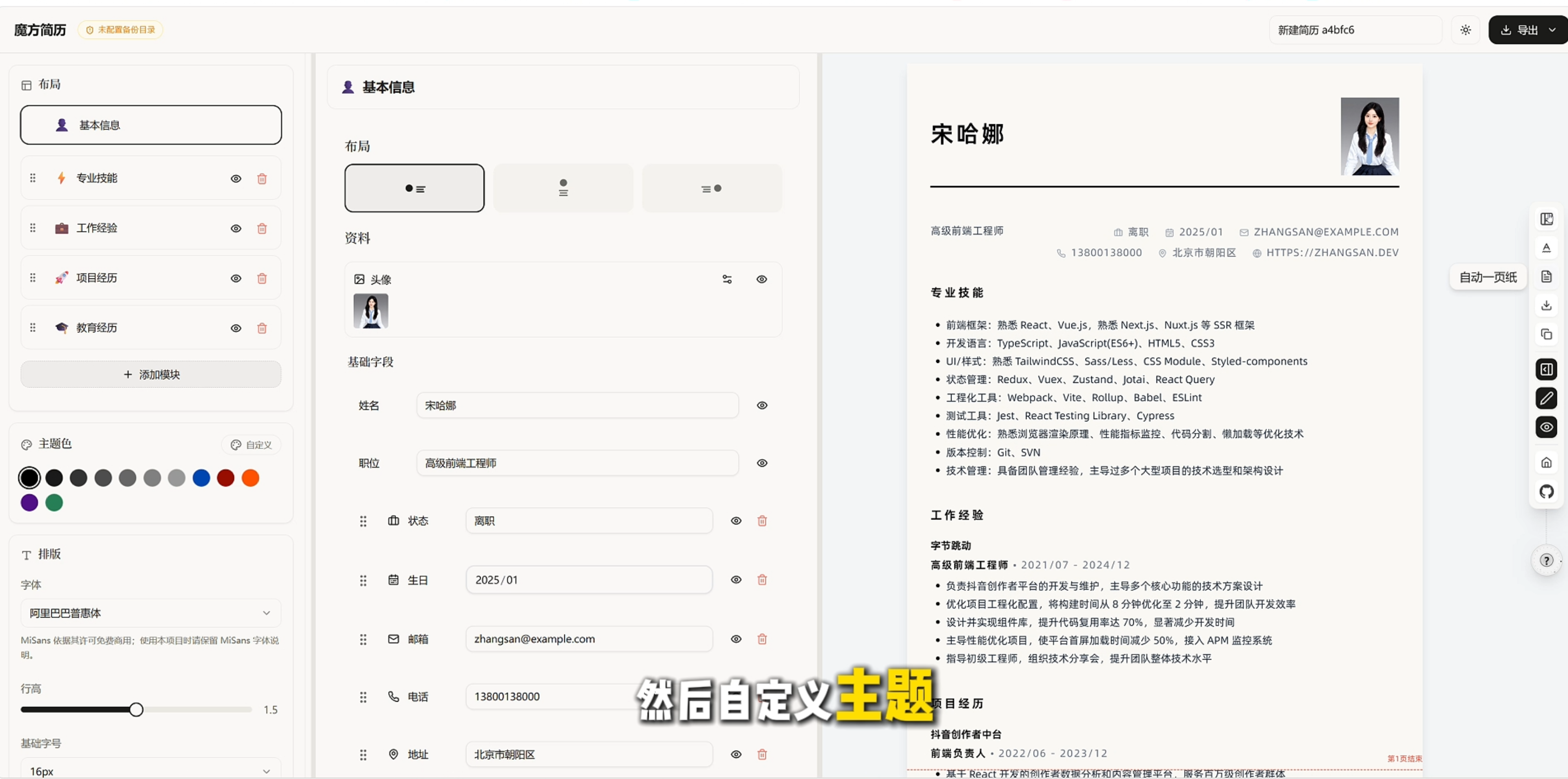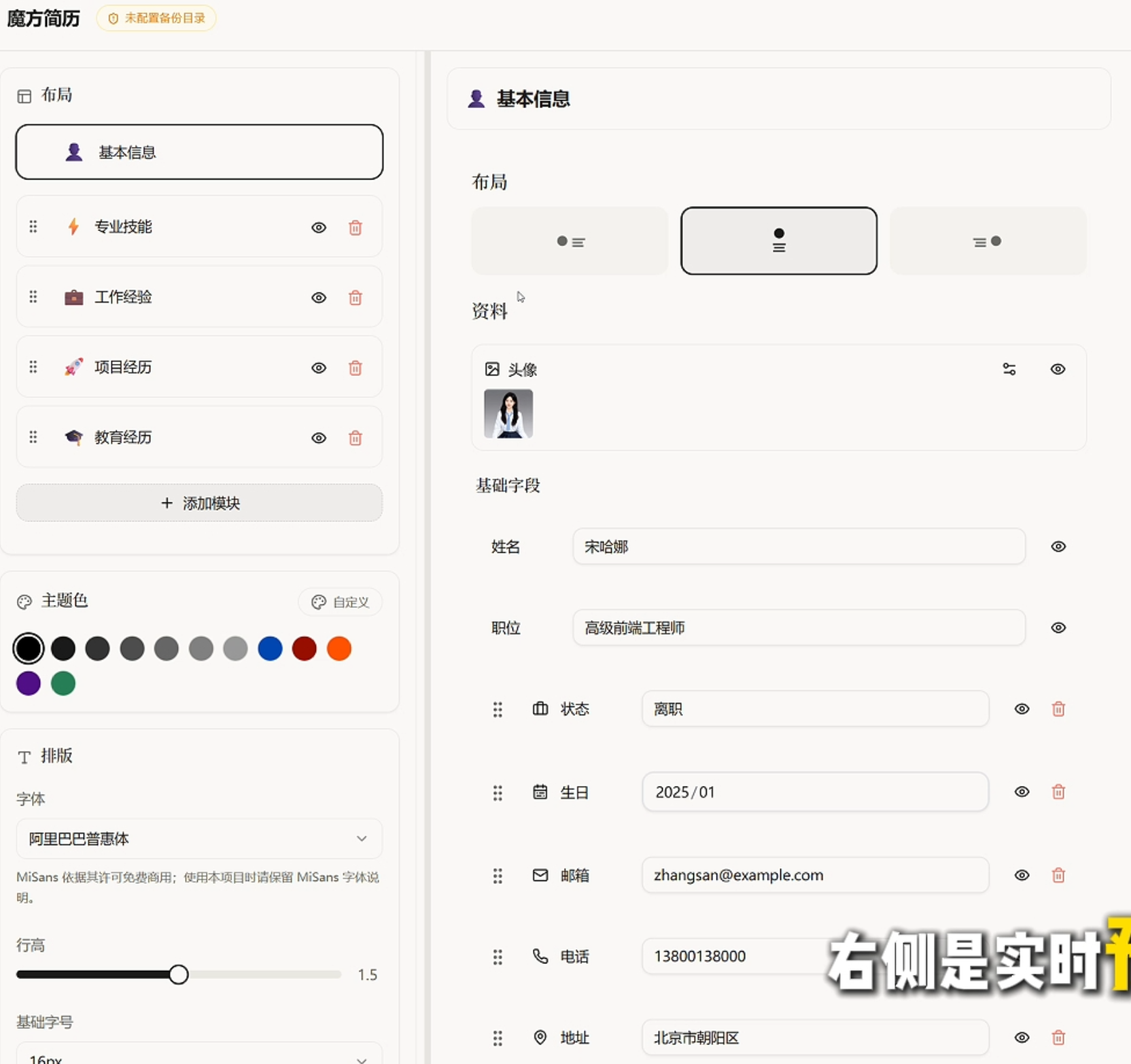 如果你对预设的模板不满意,还可以通过自定义选项调整颜色、字体大小等细节。魔方简历的设计非常灵活,完全可以根据你的需求进行个性化定制。