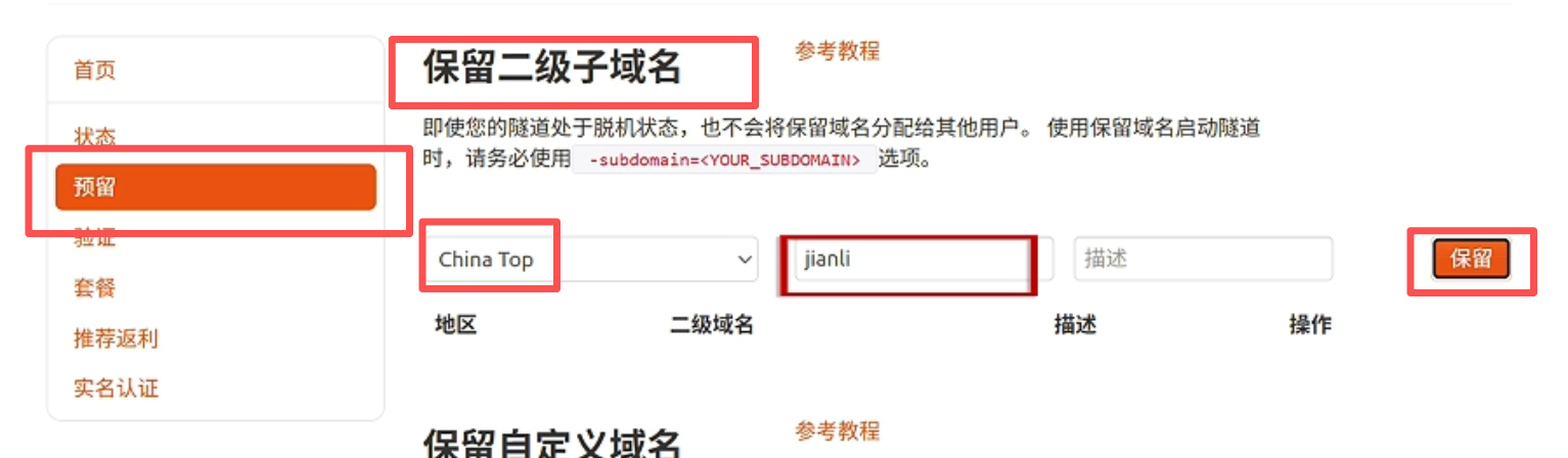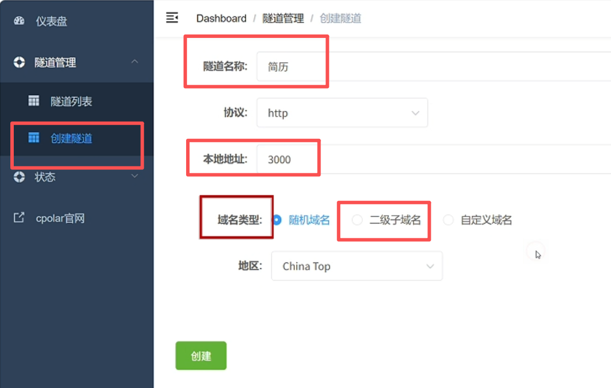 • 域名类型:我为了长期使用所以选择二级子域名,如果只是测试可以选择随机隧道