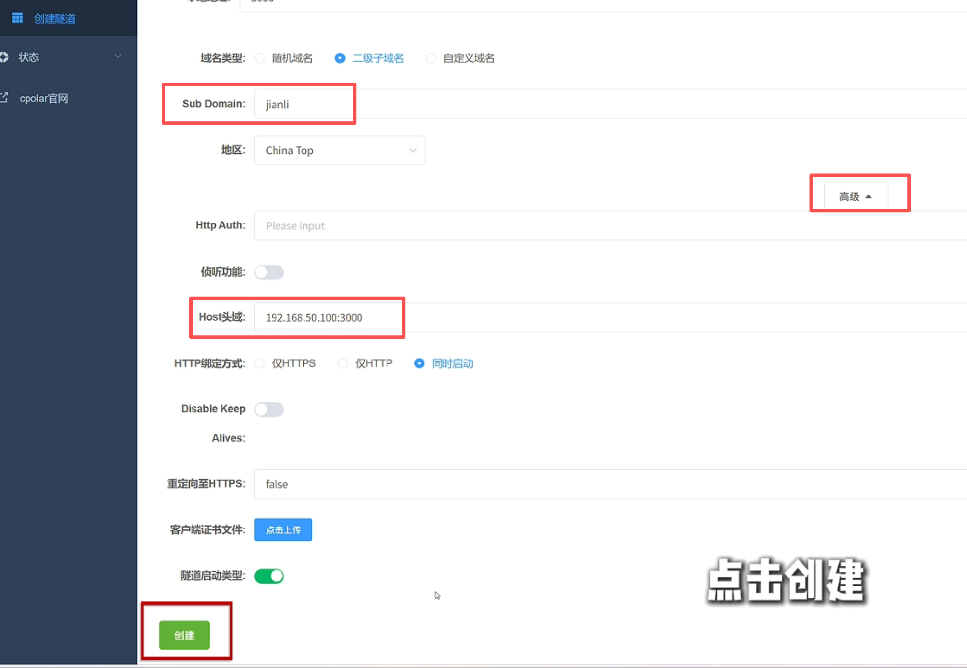 回到配置界面,粘贴你预留的二级子域名。点击“高级”,找到“host头域”,填写 ip地址:3000(例如:192.168.1.1:3000)。点击“创建”。