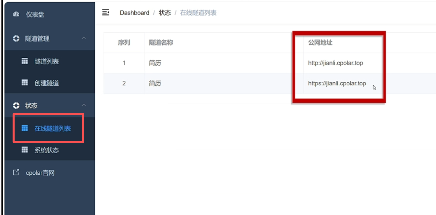 打开在线隧道列表,能看到我们生成了两条好看又好记的公网地址