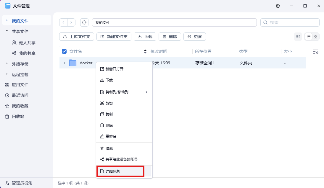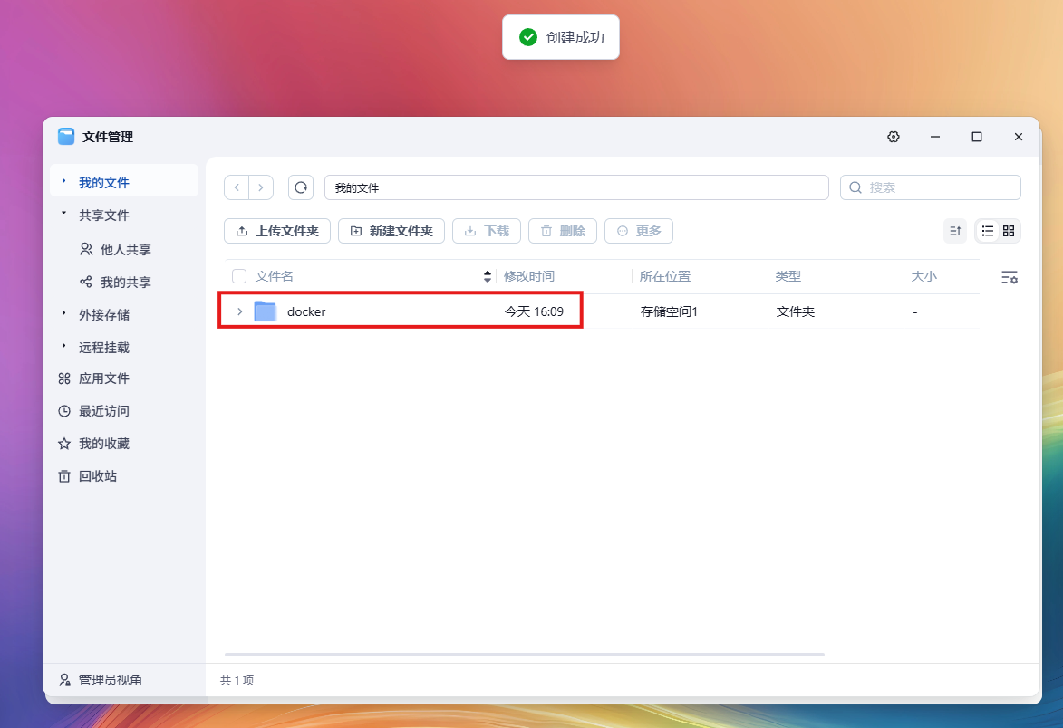 打开文件管理,创建一个docker文件(我是用来存放docker部署的应用):