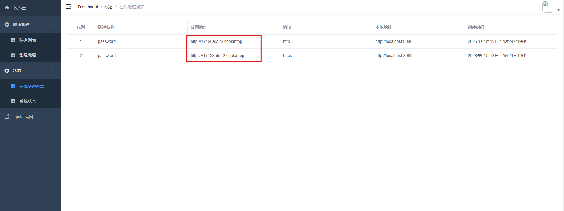 更新完成后,打开在线隧道列表,此时可以看到随机的公网地址已经发生变化,地址名称也变成了保留和固定的二级子域名名称。